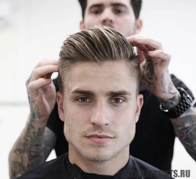 - Классическая – этот вариант причёски предусматривает максимально выстриженные волосы на затылке и в области висков, а также длинные пряди на макушке (не менее 8-10 сантиметров). Обязательным является резкий переход, который создаётся между короткими и длинными прядями. Волосы зачёсываются наверх или набок с пробором.
